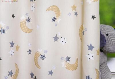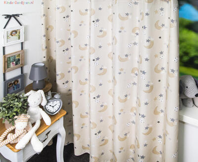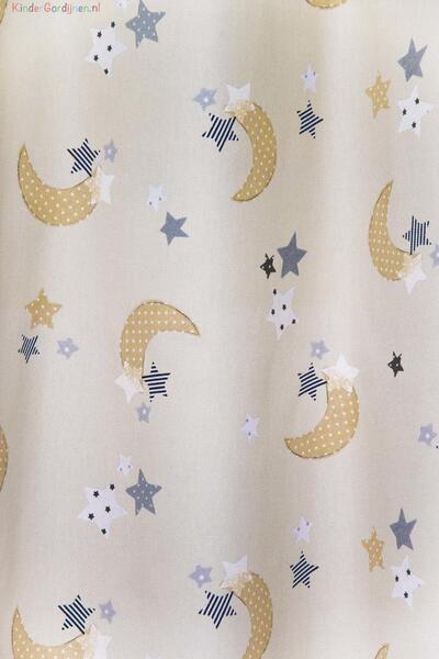 Wat een schitterende kwaliteit gordijnstof! Zien is geloven, zo mooi soepel geweven én maar liefst 280 cm breed! Dat betekent dat het babykamer gordijn meestal naadloos kan worden gemaakt. De is print is gedrukt op een heel fijn geribde stof, wat een vlotte & sportieve uitstraling geeft. Het sterretjes & maantjes patroon is leverbaar in 3 verschillende ondergrondkleuren. Eigentijds blauw- grijs voor de jongenskamer, pastel roze - grijs voor meisjes slaapkamer en camel grijs voor als je liever geheim wilt houden welk lief kleintje er komt slapen. De maan is hier 7 cm groot en samen met de sterren ernaast 9 cm breed. Door het rustig herhalende patroon kan je dit gordijn uitstekend tot de grond laten confectioneren. Wanneer je graag extra verduistering wenst dan optie voeren aanvinken in het bestelproces. Kortom, deze fraaie stofserie is een aanwinst binnen onze enorme collectie!
