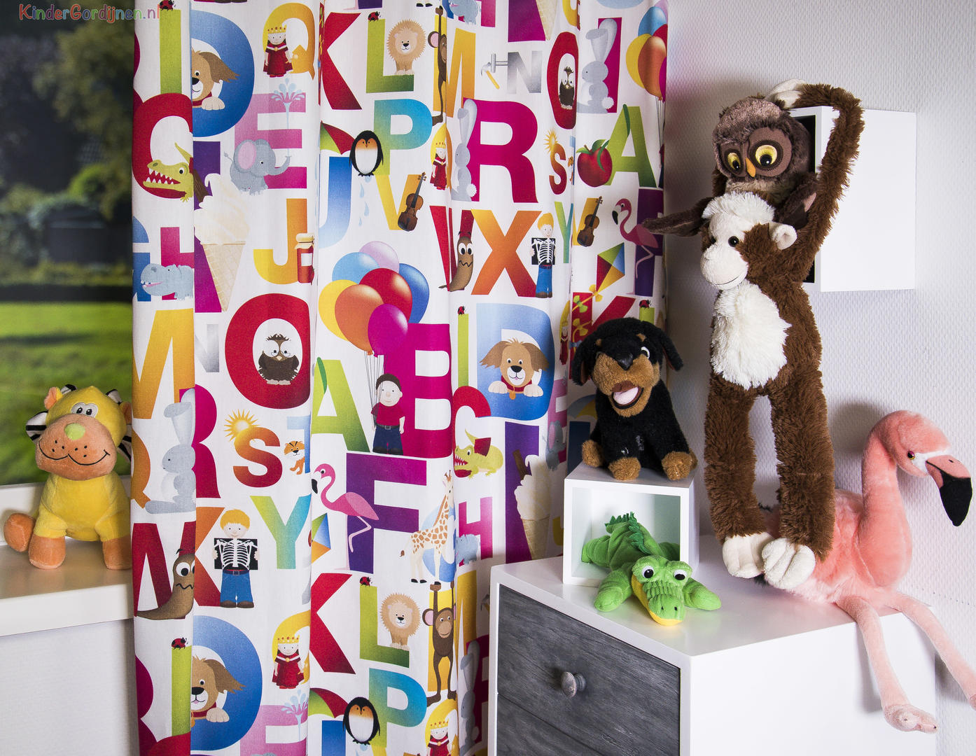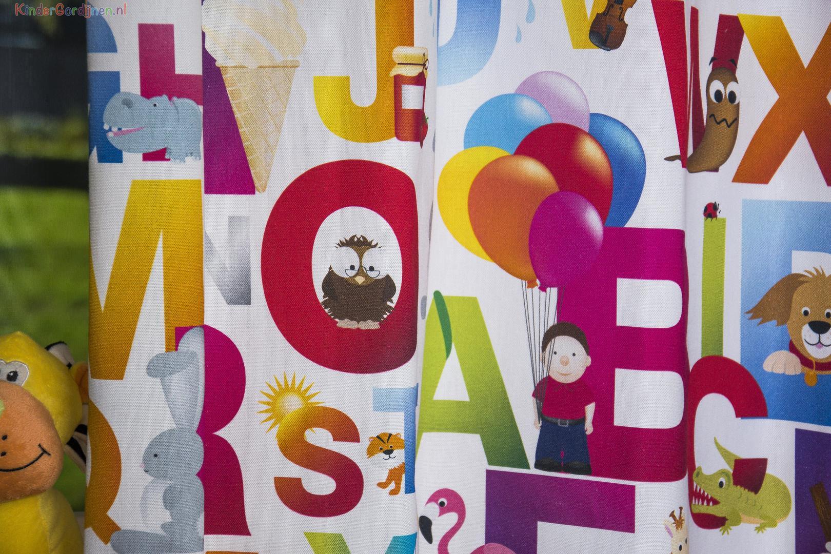 ABC... Een vrolijk gordijn voor de kinderkamer met een print van het alfabet. Kleurrijk en educatief tegelijk! Leuk voor zowel de jongenskamer als voor de meisjeskamer. Voor verduistering even voering toevoegen in het bestelproces.