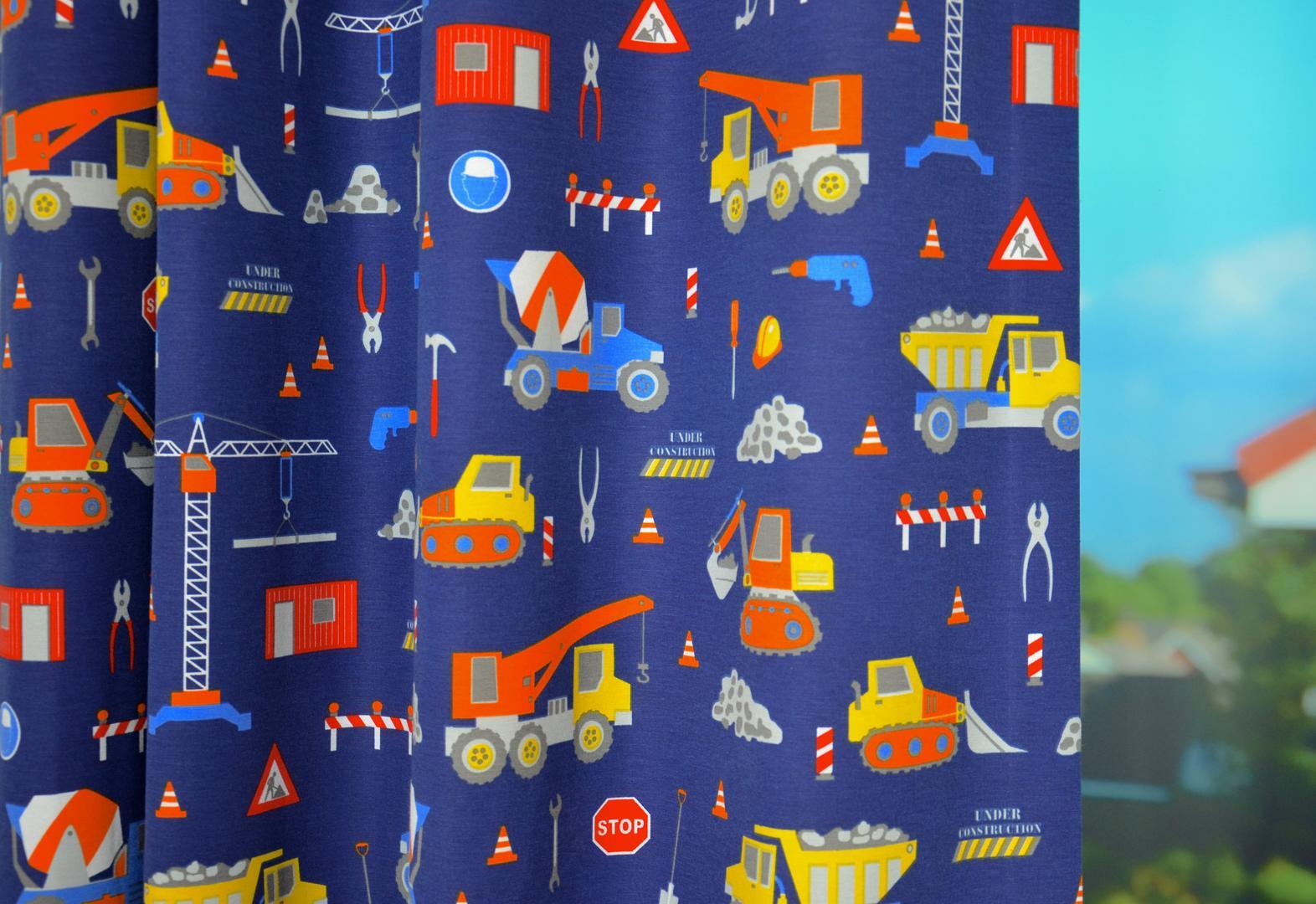 Werk aan de weg! Van kiepwagen, graafmachine tot veiligheidshelm; het staat allemaal afgebeeld op dit stoere jongensgordijn. Je kan zo vanuit je eigen bed een fantasie verhaal bedenken! Wat gaat er vandaag gebeuren op de bouwplaats? Is het ruw terrein of misschien zelfs een kiezelgroeve? De vrachtwagens zijn zo’n 14 x 8 cm groot en gedrukt op diep donkerblauwe sportieve stof. De vrolijke kleuraccenten geel, oranje, rood zijn leuk om verder te gebruiken in de slaapkamer. Voor kleurbehoud van de terreinwagens én het gordijn, even laten voeren. Dan is het óók direct prettig donker.