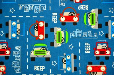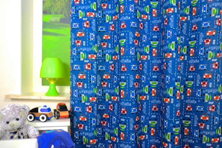 Vrolijke jongens gordijnen ‘Beep in the city’. De autootjes zijn 4 cm groot en vrij strak grafisch verdeeld over de lichtdoorlatende stof. Dat geeft een rustig effect. De ondergrondkleur is donkerblauw. Autootje Beep heeft grappige koplampoogjes, die lachend je kamer inkijken. “Beep – Beep, mag ik een rondje door jou huis rijden?” Om het auto thema compleet te maken zijn er ook kussentjes te bestellen van dezelfde stof