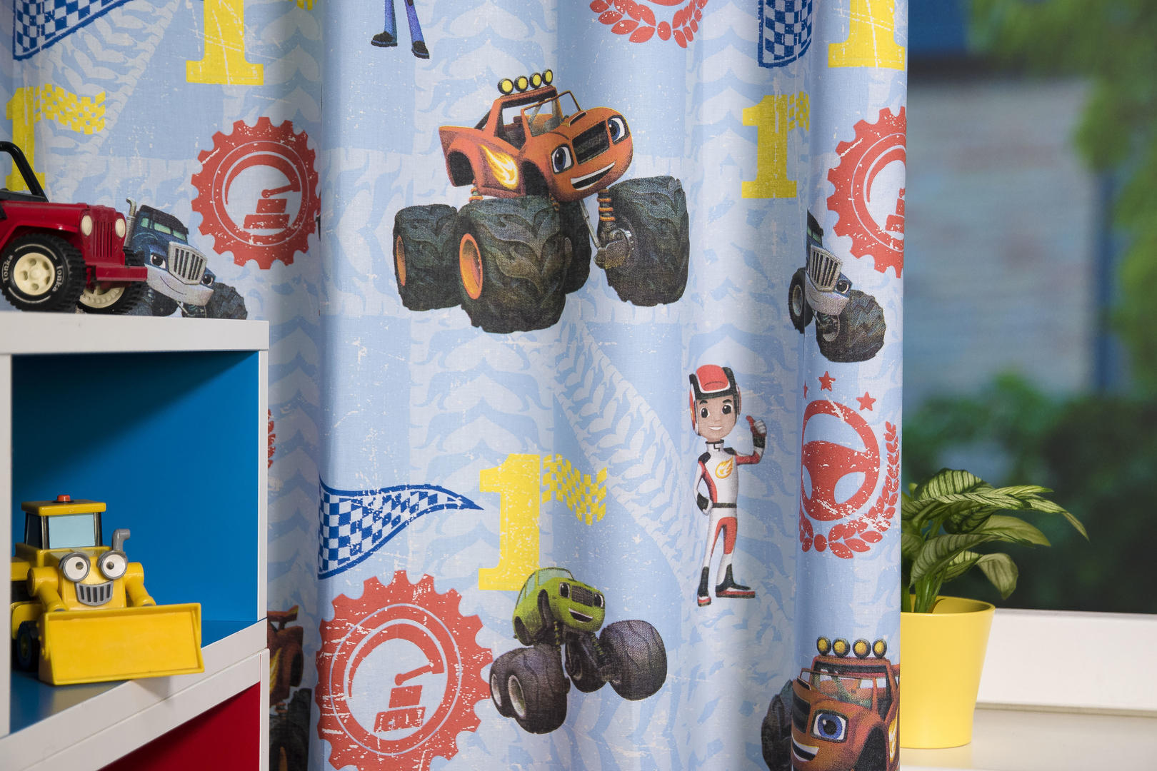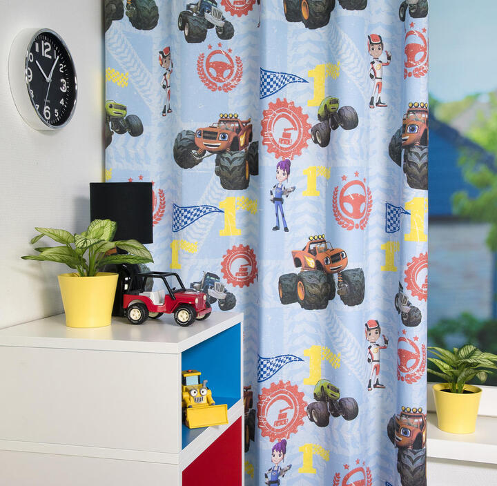 Deze gordijnstof met de naam Blaze en de Monsterwielen is gemaakt van de beste materialen waardoor het gordijn mooi in de plooi valt.