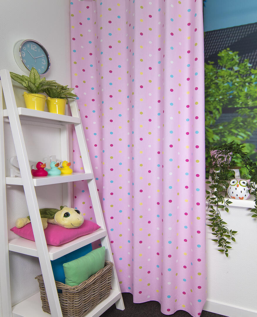 Deze gordijnstof met de naam Coloured Dots (Eijffinger) is gemaakt van de beste materialen waardoor het gordijn mooi in de plooi valt.