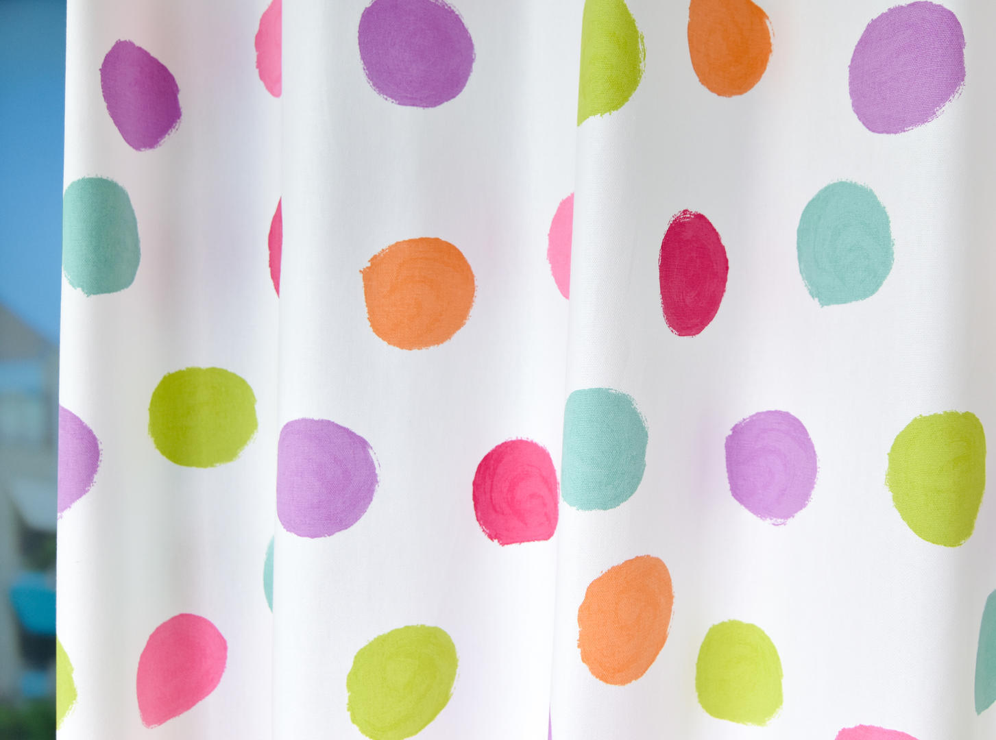 STIPPEN zijn HIP! En dit gordijn heeft royale stippen in héérlijke heldere, frisse kleuren. De stip is 7 cm in doorsnede en heeft het effect alsof zij met de kwast aangebracht zijn. Dat geeft een speels en kleurrijk effect. De ondergrond is een warm witte, dicht geweven stof, die desgewenst verduisterend gevoerd kan worden. Je kunt dit gordijn heel leuk combineren met een pittige muurverfkleur. Ook de hippe ‘ceyladon’ tint past hier uitstekend bij! Succes bij de meiden gegarandeerd!