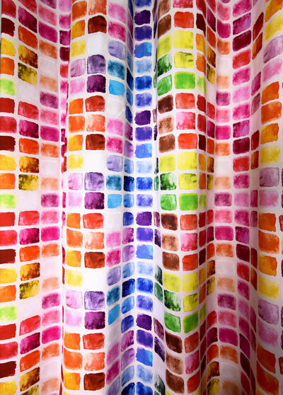 Wat een super breed kleurpallet! Dit gordijn is als een kunstenaarsdoek, al die verschillende kleurtonen. De aquarel blokjes zijn 4,5 x 4,5 cm groot en gedrukt op matte, warm witte stof. Door de geschilderde techniek en het regenboog-achtige verloop, is het subtiel en zeker niet te druk. Het gordijn is excentriek, voor de creatievellingen onder ons! Voor extra verduistering, desgewenst voeren.