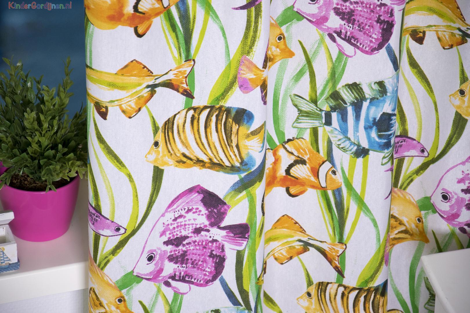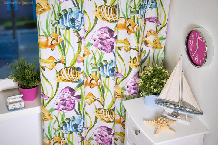 Blub, blub! Wie houdt er niet van vissen. Op dit mooie kleurrijke kindergordijn zie je allemaal mooie vissen in hun eigen omgeving, met planten en al. Het materiaal dat hiervoor gebruikt is 100% katoen. Hierdoor valt het heerlijk soepel en voelt het ook nog eens superzacht aan. Je kan je kindergordijn ook laten verduisteren in ons atelier. Vertel dit even op het bestelformulier en het wordt voor je geregeld. Wil je nu eerst het kindergordijn nog even voelen en zien. Bestel dan een knipstaal zodat je het thuis kunt bekijken in de kinderkamer. Van dit fantastisch kindergordijn is de kamerhoogte 280 cm en is de naam van dit kindergordijn Dolce. Wil jij ook niet elke avond in slaap vallen met deze mooie vissen om je heen?