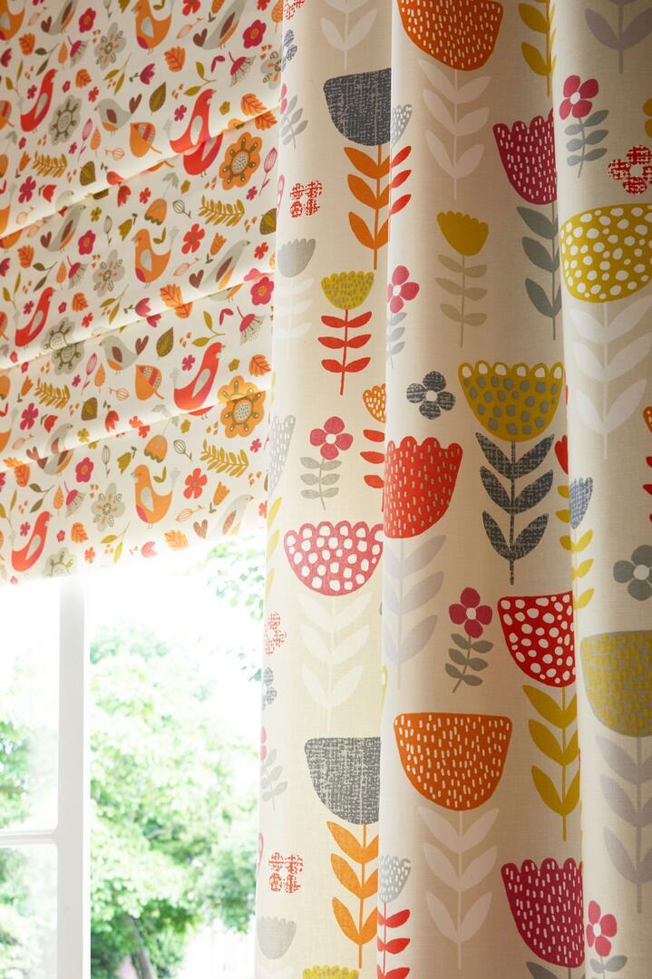 Een prachtig gordijn van Engelse boden. Dit land staat al jaren bekend om haar verfrissende & eigentijdse motieven en patronen. Zo ook dit vrolijke gordijn, leverbaar in  8 kleuren.  Het vogeltje’ is 6 cm groot, de bloemetjes variëren van 1 tot 4 cm. De stof is gemaakt van mooie dicht geweven katoen. Voor extra verduistering even laten voeren.