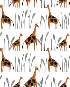 Fraai, soepel geweven gordijn dat uiterst stijlvol is door zijn eenvoud. De giraffes zijn aan de voorzijde gedrukt in een warme roestkleur. Ze hebben verschillende kleurtonen, waardoor de afbeelding zowaar geschilderd lijkt. De ondergrond laat de matte en dichte weefstructuur zien en is wolwit van kleur. De sierlijke giraffes zijn maar liefst 35 cm groot! De grafische bomen zijn zwart met grijs. Door het royale patroon kan dit gordijn uitstekend voor grote raamoppervlaktes. Je kan dit gordijn stoer combineren met een zwart rolgordijn of evt. verduisterend laten voeren. Een perfecte keus voor een kinderkamer die tijdloos mag worden!