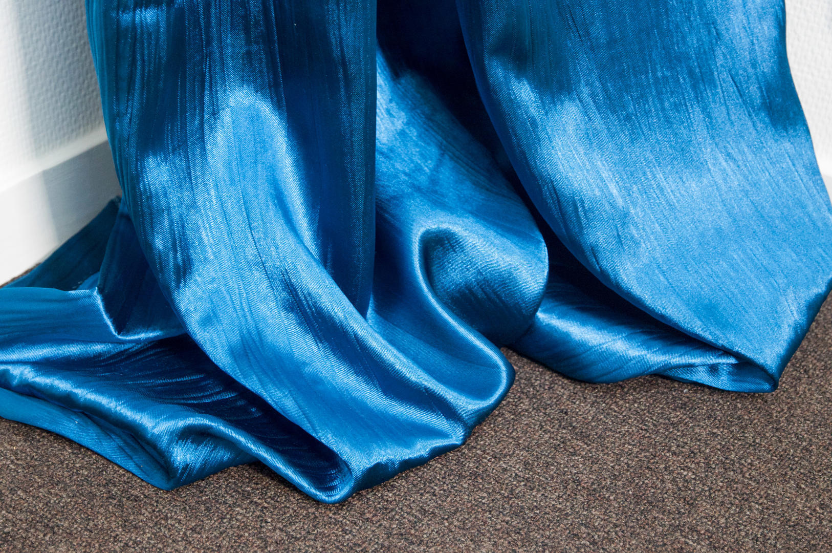 Het gordijn is tot over de vloer geconfectioneerd om de soepelheid van de fluweel zachte stof beter weer te geven.