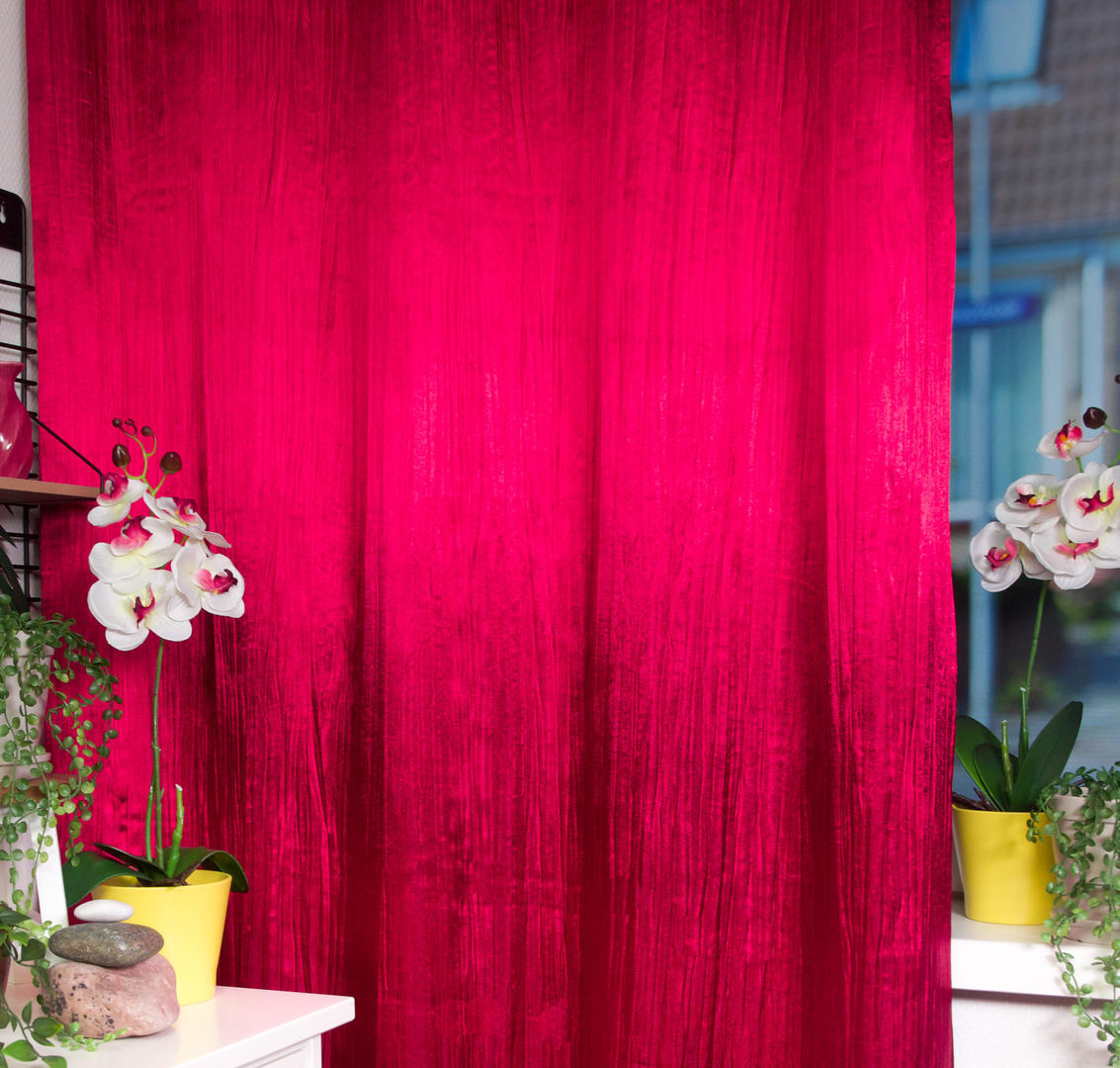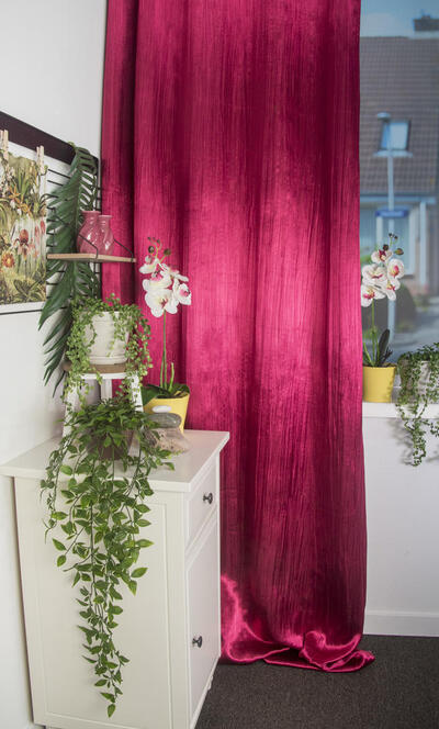 Het gordijn is tot over de vloer geconfectioneerd  om de soepelheid van de fluweel zachte stof beter weer te geven.