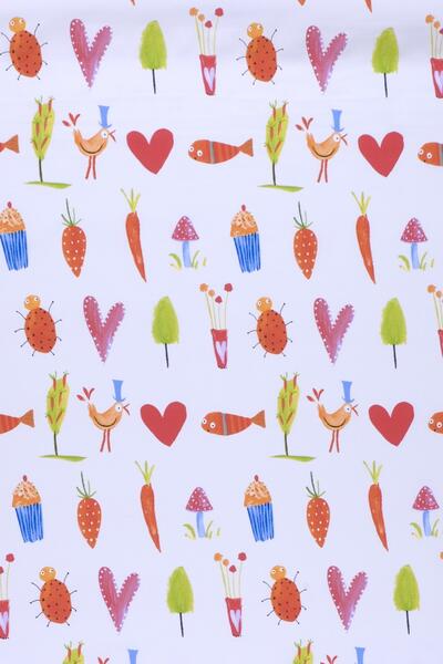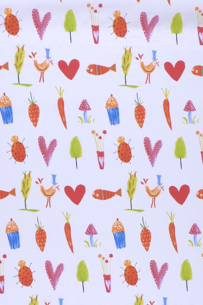 Kindergordijnen om je vingers bij af te likken! Naast de heerlijke cakejes zijn er aardbeien, ijsjes, hartjes, vogeltjes en lieveheersbeestjes verwerkt in dit kleurrijke dessin. Een gordijn wat elke kinderkamer opvrolijkt!