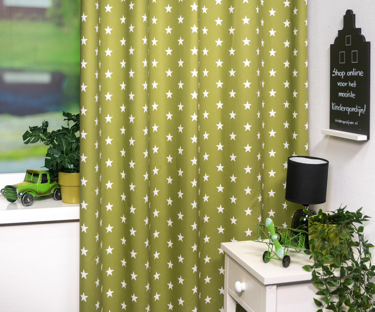Prachtige tijdloze gordijnen in een olijfgroene kleur en bomvol fonkelde sterren. De gordijnstof is tijdelijk verkrijgbaar en past vrijwel in elke kinderkamer of babykamer. Zowel voor jongens als meisjes!