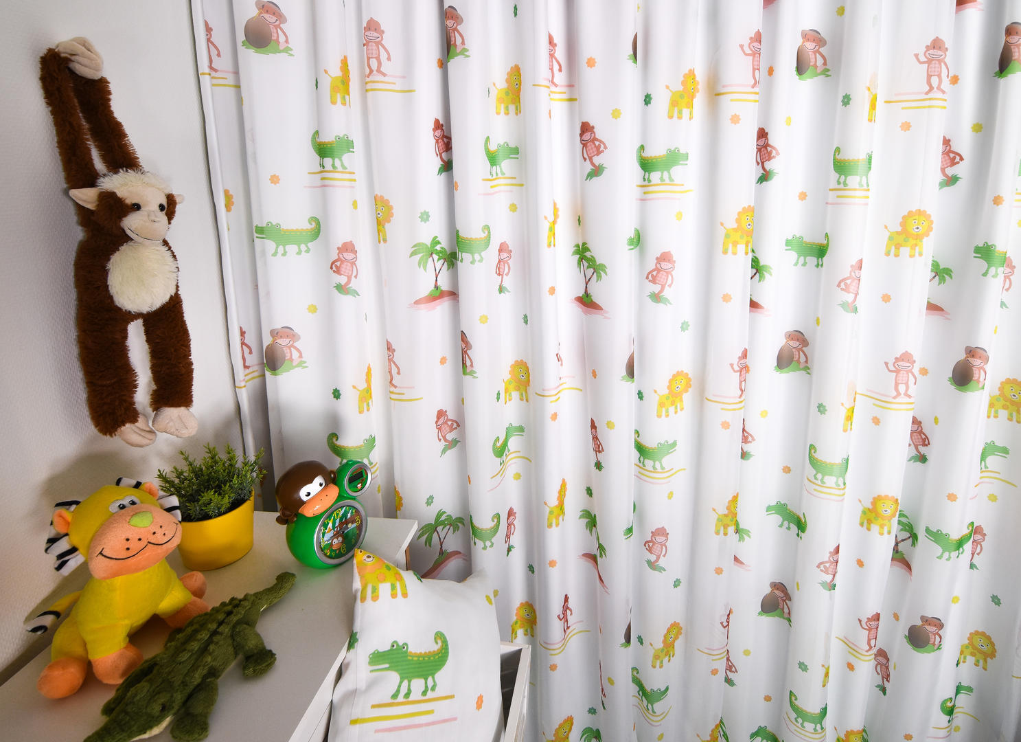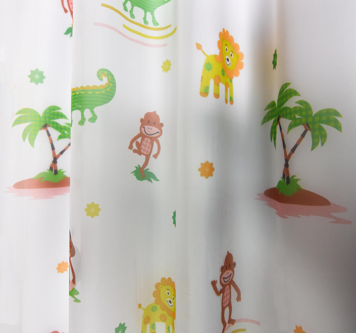 Héérlijk luchtige transparante voile, die op iedere kinderkamer héél decoratief is. Eigenlijk “kindervitrage”. De aapjes, krokodillen en leeuwen zijn afgebeeld op de egaal lichte ondergrond en aan beide zijden goed zichtbaar. De palmboom is 13 cm groot. De voile is goed tegen de inkijk, gelukkig kan je er zelf wel door naar buiten kijken. Zeker ook charmant naast een strak (verduisterend) rolgordijn. Het lijkt alsof de safaridieren in je slaapkamer wonen, word jij daar ook zo happy van? Het gordijn zoals afgebeeld op de sfeerfoto is voorzien van onze 100% verduisterende voering, waardoor een fraai moire effect ontstaat.