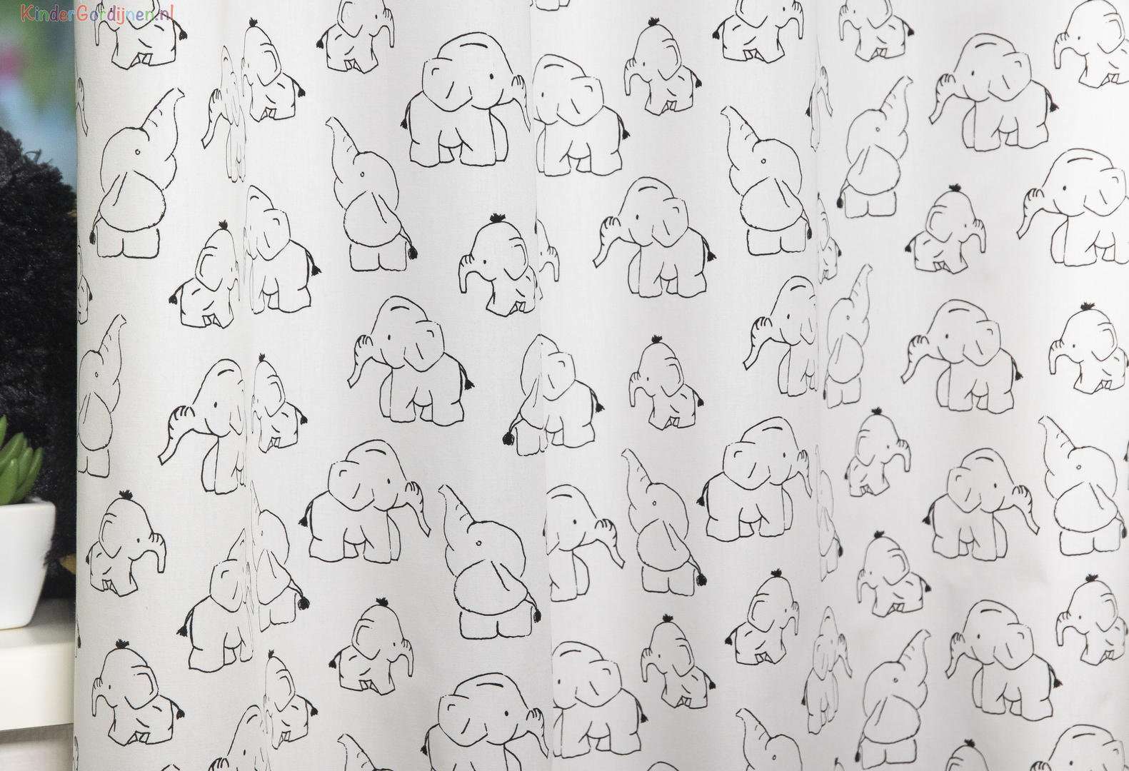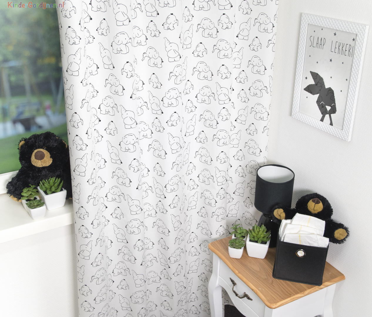 Een origineel babykamer gordijn voor de jongens- of meisjeskamer. Het inrichten van de babykamer is geweldig leuk om te doen en basic kleurgebruik is helemaal HIP. Wit, grijs- en zwarttinten zorgen voor een rustige opbouw en kan je aanvullen met leuke decoratie items. Zo wordt het kamertje gezellig en helemaal naar jouw wens! Dit gordijn past uitermate goed in deze stijl, een lief, zwart getekend olifantje siert het soepel vallende gordijn. Het vrolijke beestje is 6 x 7 cm groot en op de voorzijde gedrukt van de witte, satijnlook geweven stof. Voor het verduisteren van de babykamer is het wenselijk om de stof te laten voeren of om te kiezen voor een bijpassend zwart rolgordijn. Zo slaapt jouw kleintje vast veel makkelijker in. Geniet van die LIEVE kleine.