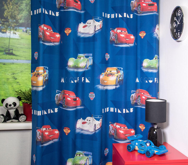 Verduisterend kindergordijn met o.a. monstertruck McQueen van Disney Cars. Een stoer jongensgordijn voor de kinderkamer van jonge autoliefhebbers!