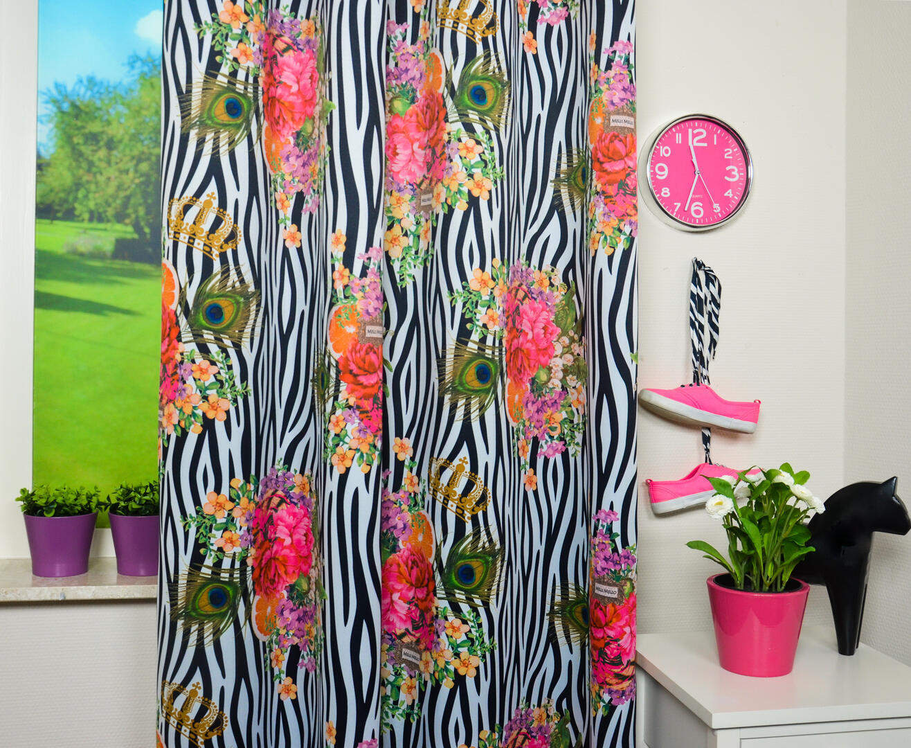 Té gek, zebraprint gordijnen van het hippe merk MELLI MELLO! Zebra is hot en daardoor super leuk te combineren met . nog méér ZEBRA! Kussens, dekbedovertrek, zwart-wit behang of misschien juist een knal-kleur? Met dit gordijn creëer jij een super eigentijdse & blitse kamer. De stof is direct dim-out, waardoor jouw kamer prettig donker wordt.. De achterzijde is gebroken wit en daardoor aardig warmtewerend. De ‘bloemenbunch’ is 25 cm in doorsnede. Zie je het al voor je in jouw kamer?