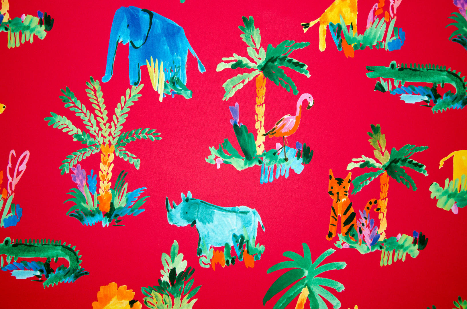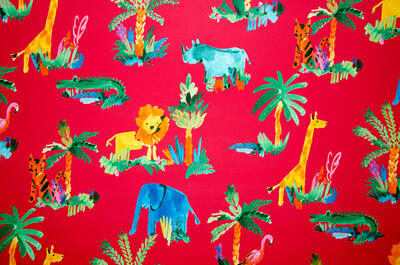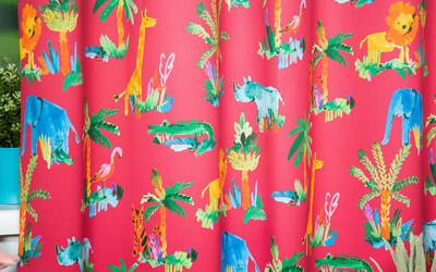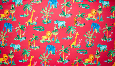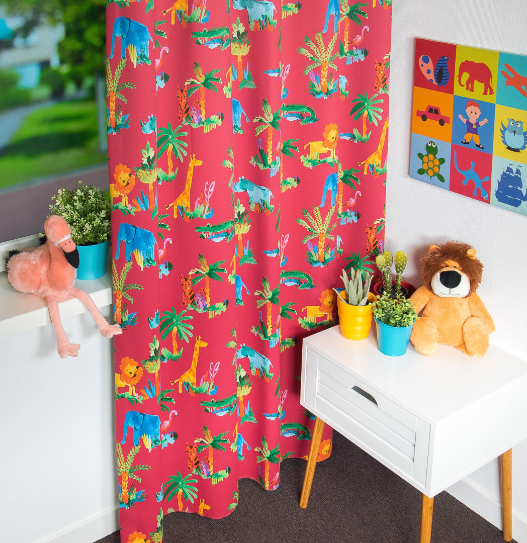 Een verduisterend TOPPERTJE, dat is dit kindergordijn! Vrolijke dieren zijn afgebeeld op bijna 100% lichtdichte stof. De print is leverbaar in 2 kleuren, met een warm-witte ondergrond of cherise rood. De safari dieren zijn met een vlotte penseel techniek als het ware geschilderd op de gordijnstof. Dat geeft een speels effect. De flamingo is 8 cm groot, de palmboom zo’n 18 cm. De achterzijde van de stof is egaal gebroken wit. Zie jij dit kindergordijn al voor je? Er is zoveel leuks op te zien en voering is niet nodig!