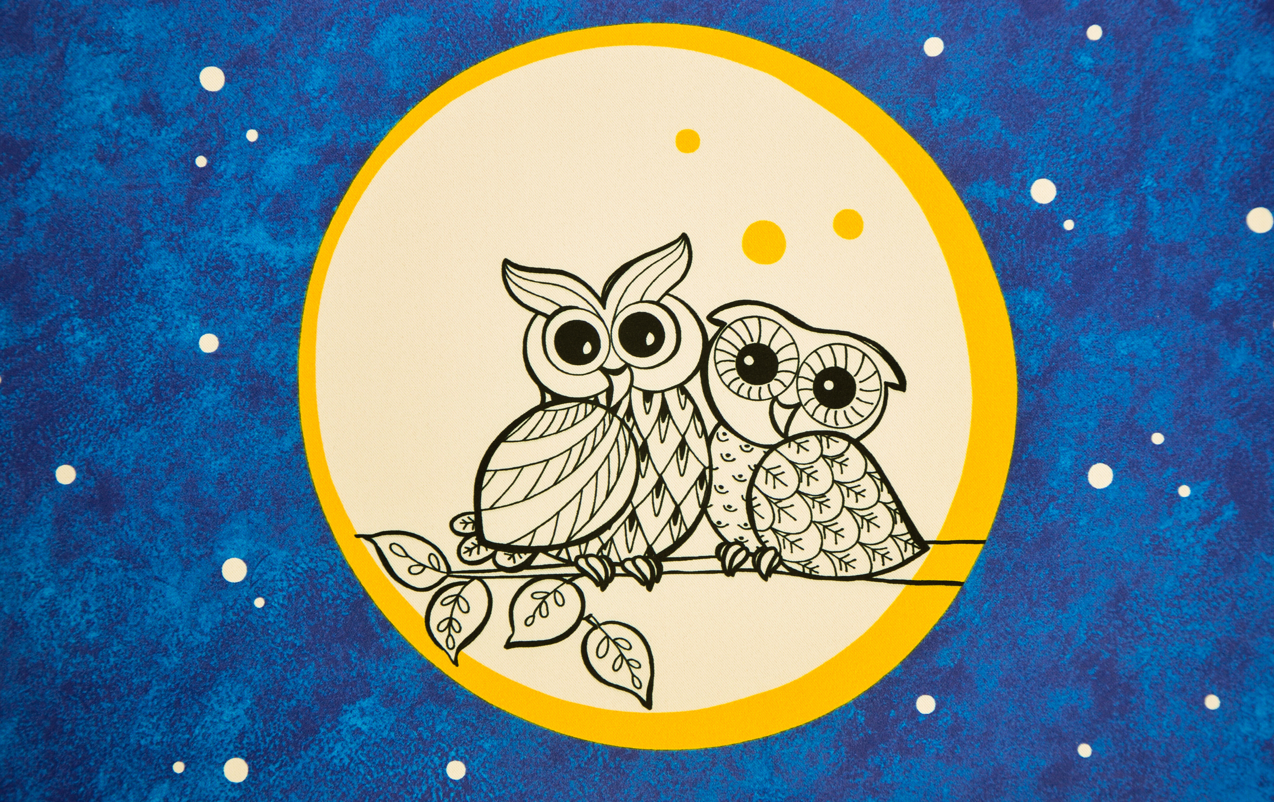 Dit is een ideaal gordijn: een leuke print die direct de kamer behoorlijk donker maakt. Dim out heet dat. Daardoor géén voeringkosten! Leverbaar in 2 kleurcombinaties, blauw met een wit motief en blauw met zachtblauw. De cirkel is 26 cm in doorsnede. Door dit royale patroon blijft de uilenprint rustig en kan het gordijn uitstekend tot de grond gemaakt worden. De witte spikkels lijken haast sterren aan de hemel te worden, zie jij dat ook?