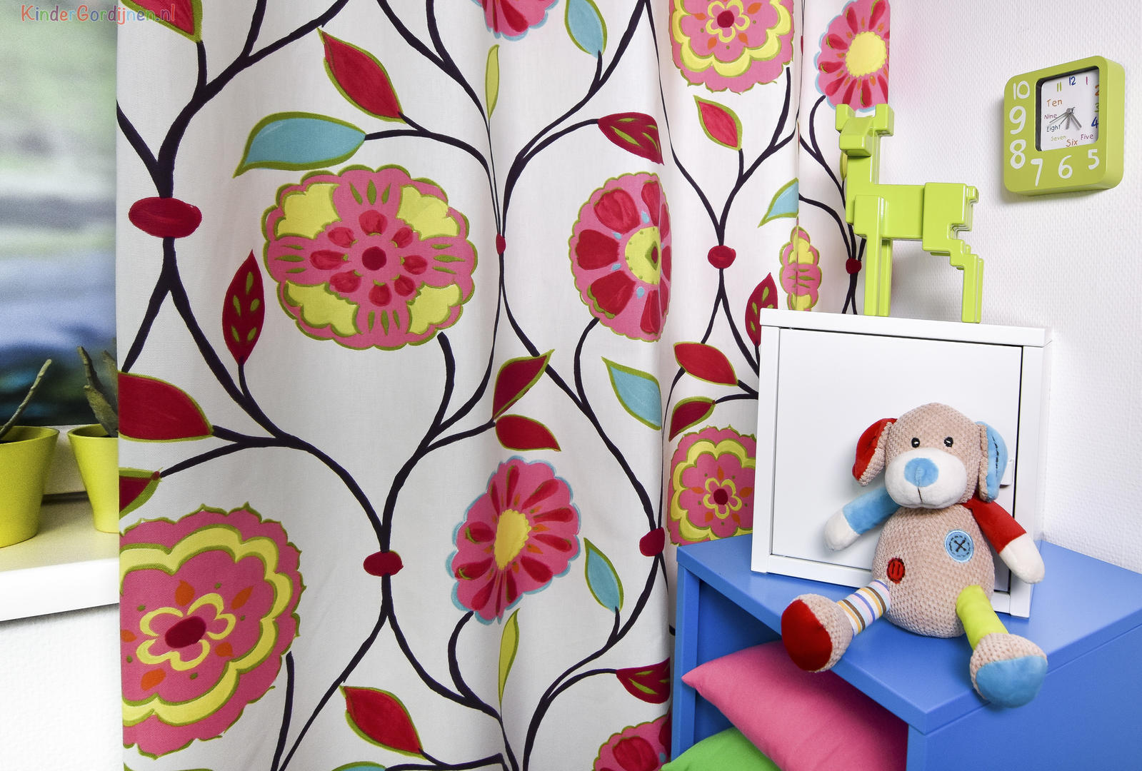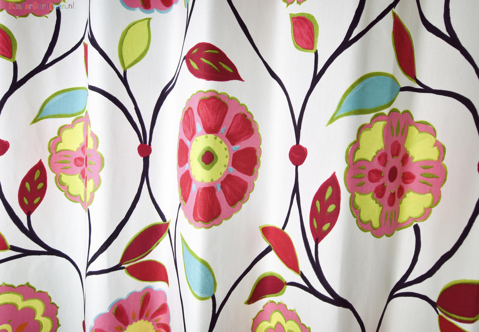 Een prachtig bloemenpatroon in de kleuren die meisjes mooi vinden. Bloemen, zoals kinderen ze kunnen tekenen; vrolijk en fantasierijk. Maak er een vrolijke boel van met dit gordijn waarmee je altijd de lente in huis hebt. De grote roze bloem met groene buitenrand is ongeveer 17 cm in doorsnede. De ondergrond is offwhite en laat daardoor licht door. Wil je een toch donkere kamer? Kies dan voor een verduisterende voering.