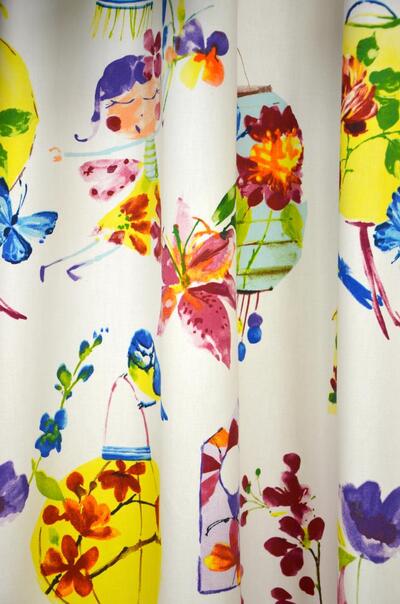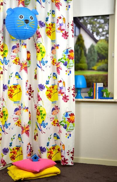 Prachtige uitvoering van een exotisch kindergordijn. Maak een kleurrijk circus van de kinderkamer met deze schitterende gordijnstof vol vogels, lampionnen, bloemen en meisjes. Verkrijgbaar in twee verschillende uitvoeringen.