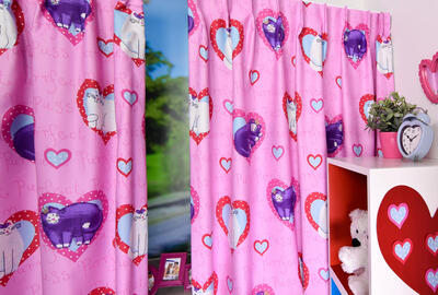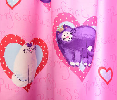 Snoezig poezengordijn met rode, roze en paarse hartjes. De Perfect Puss is een echt meidengordijn voor poezenliefhebbers.