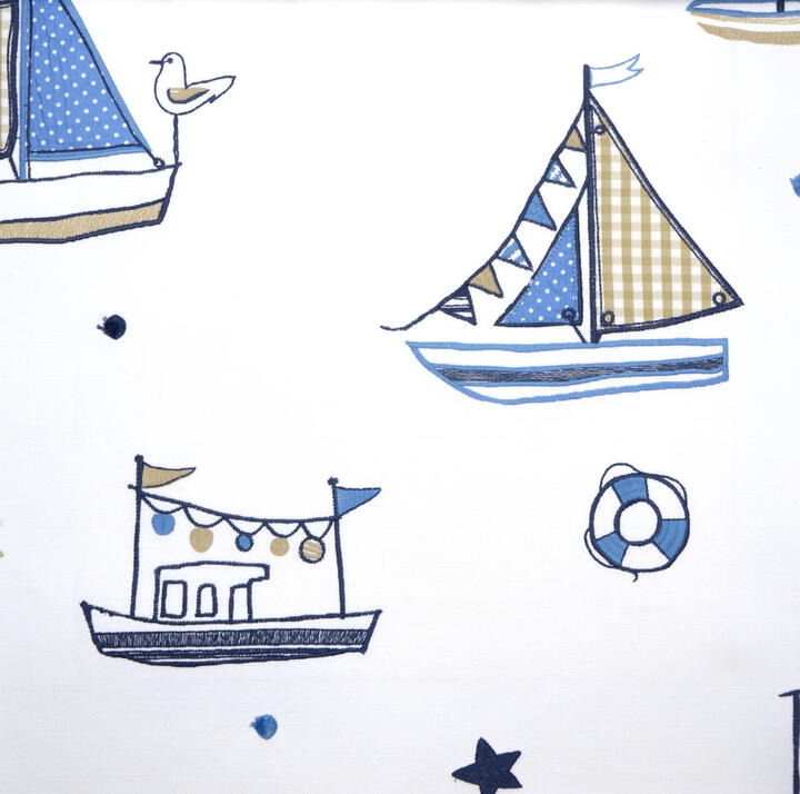 Dit is een bijzondere (nautische) gordijnstof, de scheepjes zijn er op geborduurd! Ook de zeilen zijn van echte opgestikte patchwork stof gemaakt. Dat geeft een prachtig reliëf aan deze ietwat ruw geweven katoen. Dat effect zorgt zeker voor een extra verfijnde finish aan jouw slaapkamer! Het bootje is zo'n 18 cm groot en zeilt zó jouw kamer in. Sail away Captain!