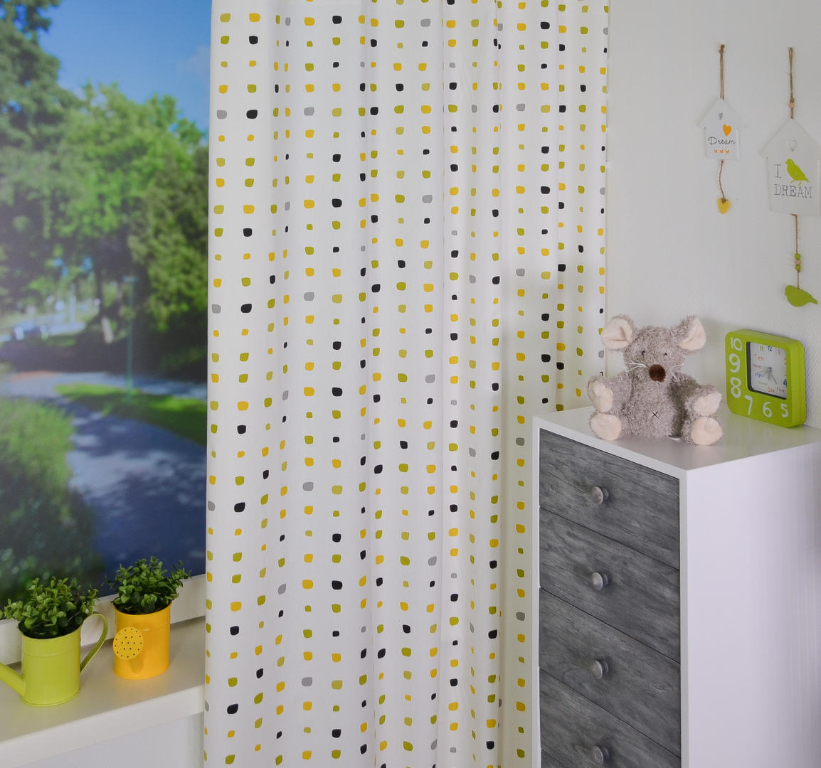 Houd je van kleur, maar op een subtiele manier? Dan is dit gordijn iets voor jou! Vele kleurvlakjes sieren het gordijn, met als inspiratie een creatief schilderspalet. De gekozen tinten volgen elkaar harmonieus op en daardoor kan dit gordijn uitstekend tot de grond geconfectioneerd worden. Het blijft een evenwichtig en toch speels geheel. De ondergrond is warm wit en de stof mooi royaal dicht geweven. Dat ziet er kwalitatief héél goed uit! Voor een donkere slaapkamer kan je het gordijn desgewenst laten voeren. Leverbaar in 5 kleurpaletten, dus jouw voorkeur zit er zeker bij.