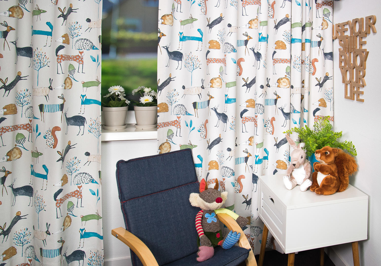Fraai gordijn voor de meisjes- en jongensslaapkamer. Kunstzinnig getekende bosdieren komen gezellig bij je ‘buurten’ en maken de kamer direct gezellig & sfeervol. De afbeeldingen zijn gedrukt op dicht geweven, matte katoen. De ondergrondkleur is warm wit en de stof leverbaar in 3 verschillende kleuren. Houd je van schattig, maar niet al te zoetsappig, dan is dit gordijn perfect! Voor extra verduistering even voeren aanvinken in het bestelproces.