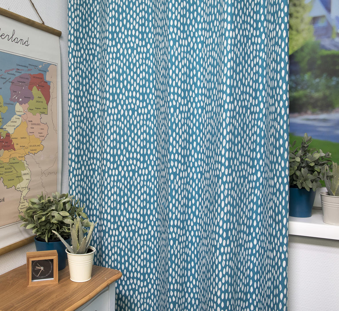 "Zachtjes tikt de regen..." De subtiele druppeltjes print op dit katoenen gordijn geeft de kinderkamer een rustgevende sfeer. Decoratief, maar toch tijdloos. Het gordijn is leverbaar in acht verschillende kleuren en daardoor geschikt voor de babykamer, meisjeskamer of jongenskamer. Het is mogelijk om verduisterende voering toe te voegen om de kamer donker te maken. Dit zorgt meteen voor extra bescherming en isolatie.