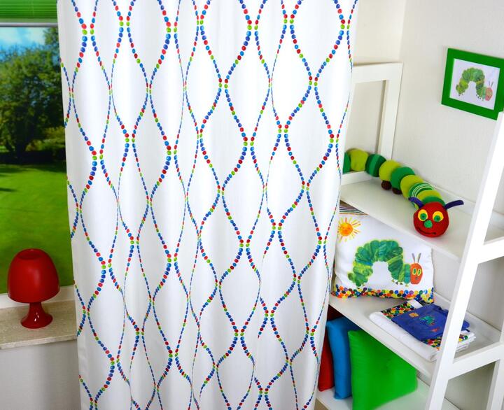 Wat een kleurrijk gordijn met deze tijdloze grafische vorm. Door die rustige, herhalende golven is deze stof zeer geschikt om tot de grond te laten maken. Het geeft zelfs ‘voor het oog’ wat extra hoogte aan de kamer! De ondergrond waarop de stipjes gedrukt zijn is gemaakt van een ietwat ruw geweven, sportieve katoen. De afstand tussen de glooiende golven is 16 cm. Leverbaar in twee verschillende kleur paletten, waardoor geschikt voor iedere kinderkamer.