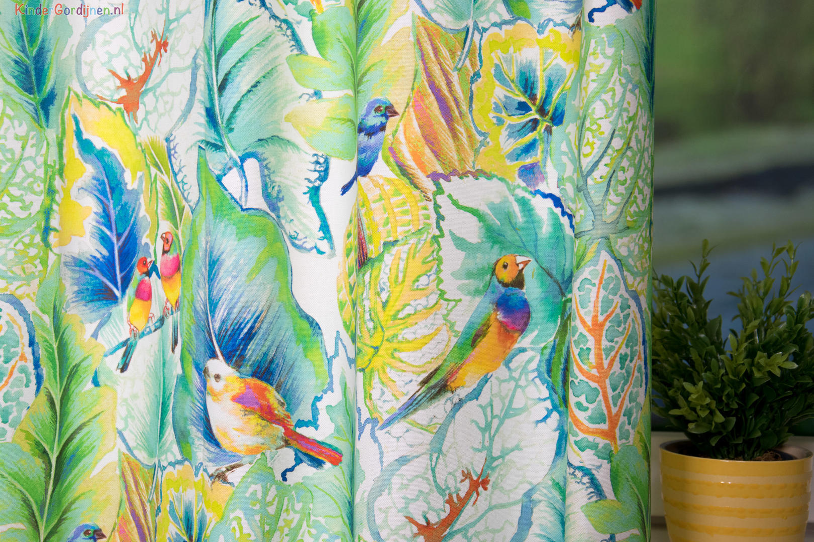 Deze gordijnstof met de naam Love Birds is gemaakt van de beste materialen waardoor het gordijn mooi in de plooi valt.