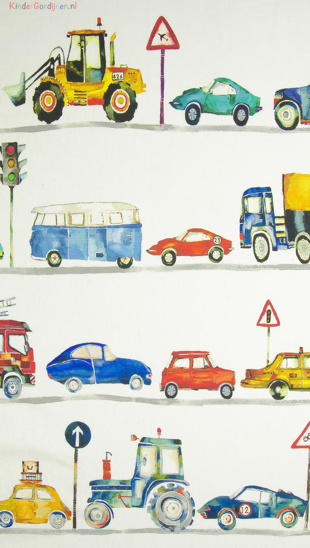Een file was nog nooit zo leuk! Dit kindergordijn met auto’s, tractoren en vrachtwagens in vrolijke kleuren, maakt van iedere jongenskamer een gezellige plek. De grote verticale banen van ongeveer 20 cm, zorgen ervoor dat de print niet te druk wordt. Door de grote variatie aan voertuigen verveelt dit gordijn nooit! Je kunt kiezen voor een stoere lichtgrijze/off-white achtergrond, of voor een neutrale witte achtergrond. De gordijnstof is van 100% katoen en kan indien gewenst verduisterend worden geleverd.