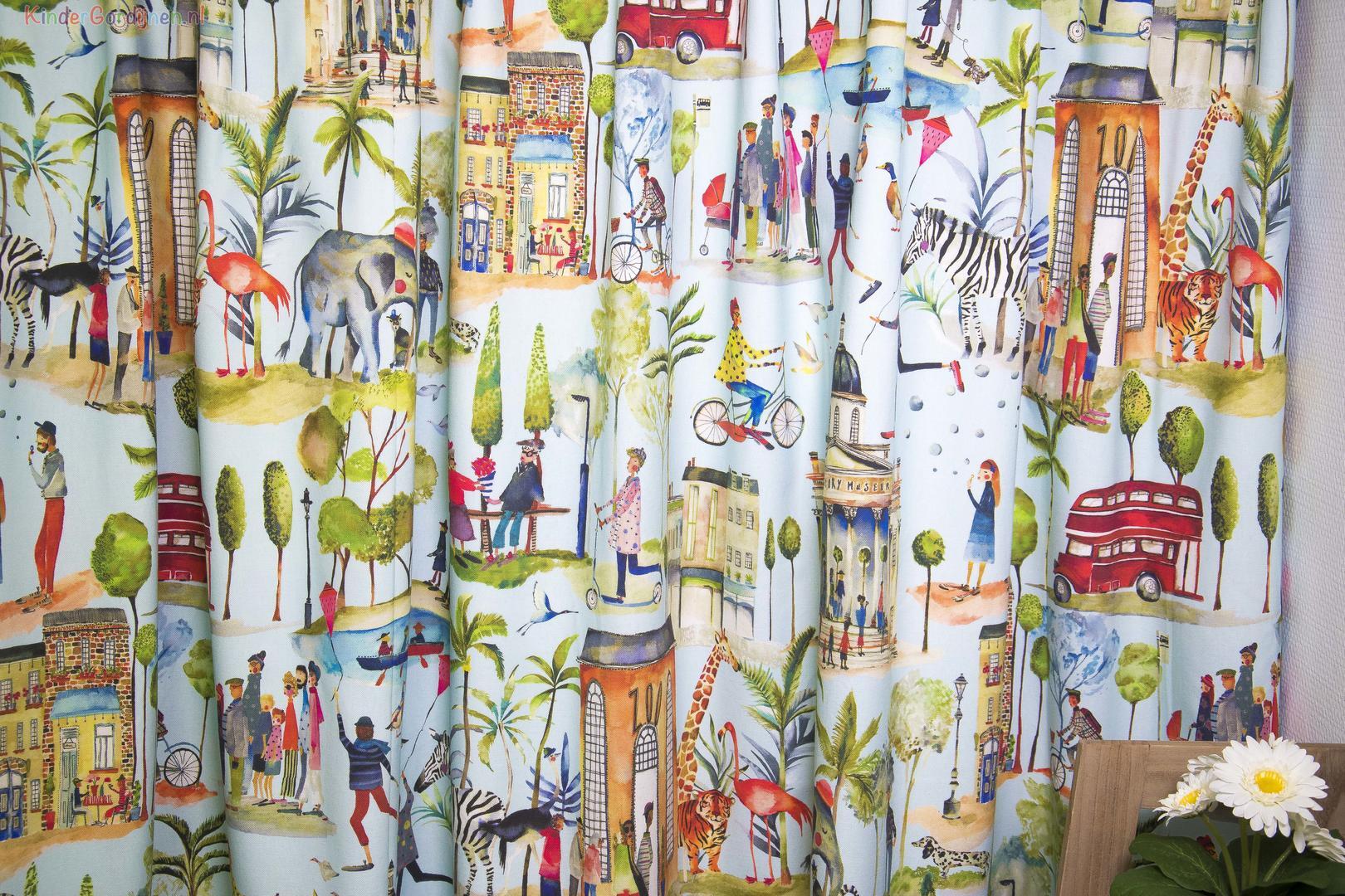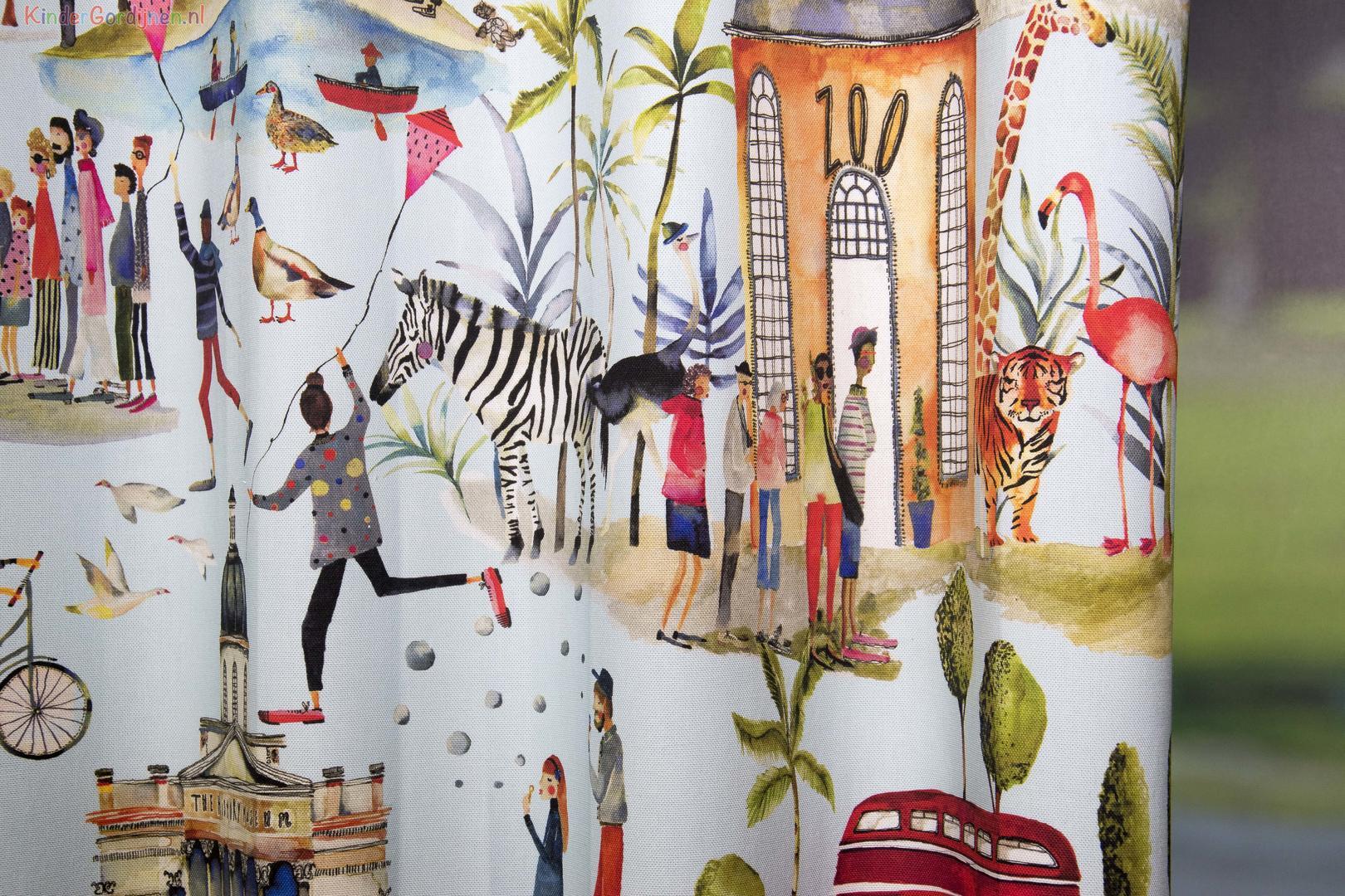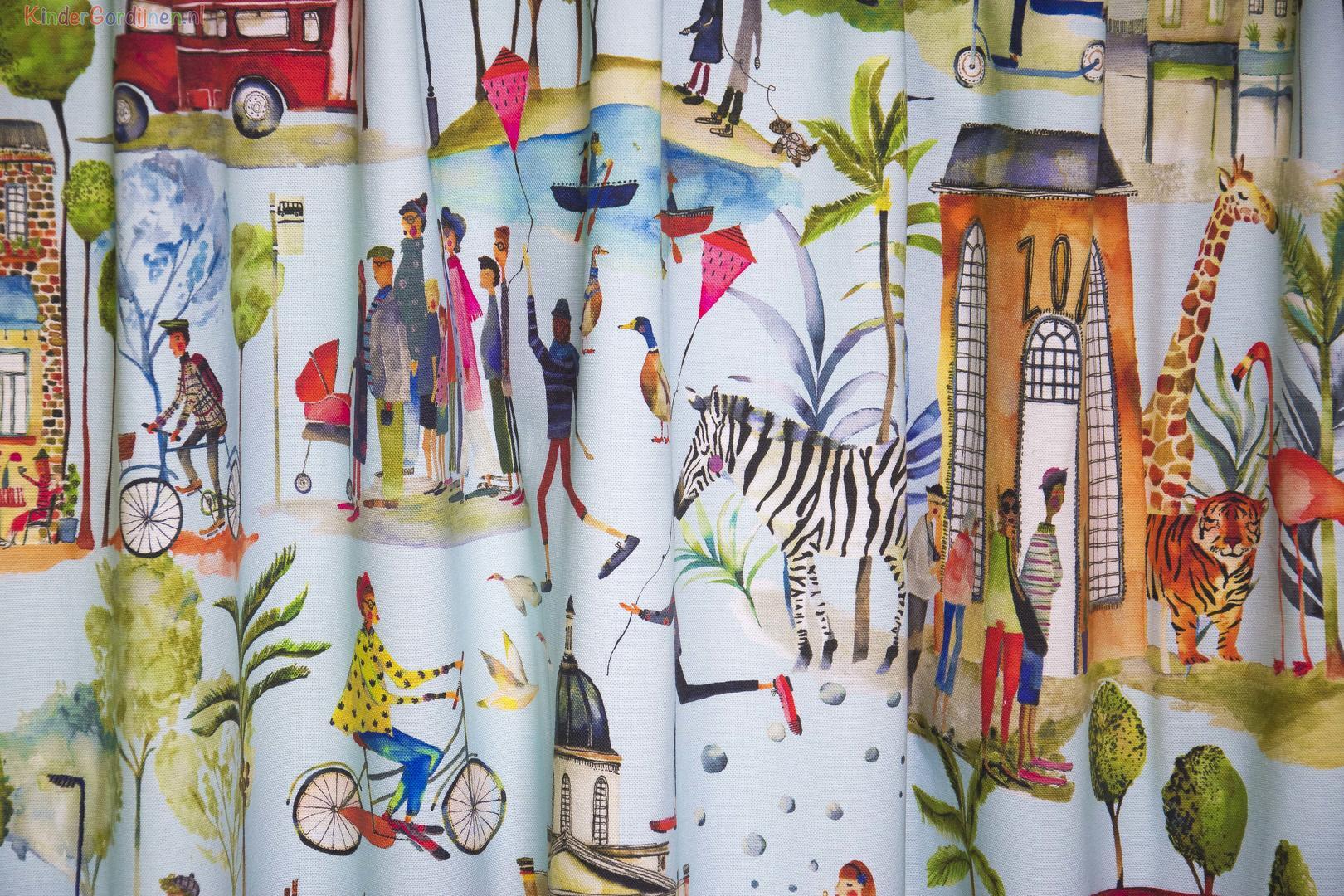 Wat een super tof kindergordijn is dit weer! Bekijk de kleuren en hoe mooi alles tot zijn recht komt! Het is het thema Out and About. Dit betekend allerlei verschillende dagjes uit die je ziet. Zoals de dierentuin of fietsen. Het is een super soepel 100% katoenen gordijn en is nieuw in het assortiment. Je hebt keuze uit twee verschillende kleursamenstellingen. Een tip van flip: Bestel eerst een knipstaal/sample, zo weet je precies welke kleur en kwaliteit je gordijnen hebben.