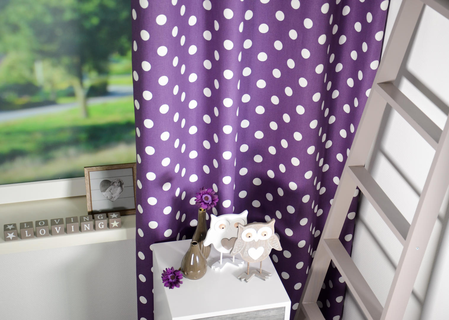 Een STIP is HIP! Op een mooi dicht geweven stof zijn deze eigentijdse stippen gedrukt. De stof is fraai mat en de licht geruwde weefstruktuur zichtbaar. Dat geeft en vlotte uitstraling. De ondergrondkleur is aubergine paars. Deze diepe kleur is rustig & toch stijlvol! Je kunt het gestipte patroon heel goed combineren met andere motieven. Van zomerse bloem tot zilveren ornamenten behang. De stip is 3 cm in doorsnede. Doordat we deze stof royaal hebben ingekocht is een super snelle levering gegarandeerd! Alleen voor extra verduistering optie voeren aanvinken in het bestelproces.