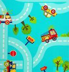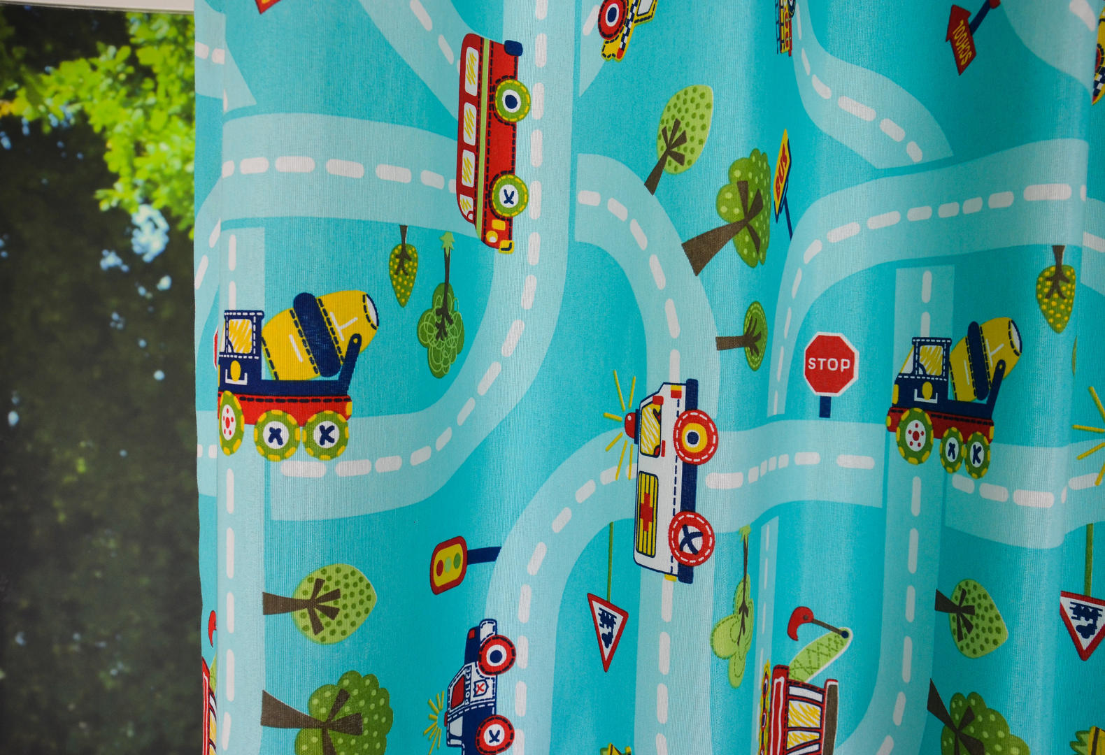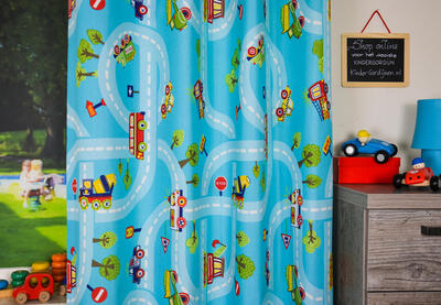 Dat is leuk! Een autoroute op je gordijn! Van brandweerauto tot cementwagen rijdt er op de weg. Jij mag in jouw slaapkamer de route bepalen. De auto’s zijn +/- 10 x 8 cm en de stof leverbaar in 2 frisse, eigentijdse kleuren. Door het royale patroon kan dit gordijn uitstekend voor grotere raamoppervlaktes. Tevens kamerhoog, waardoor je voor hetzelfde geld de stof tot de grond geconfectioneerd krijgt. Welke jonge vent wordt hier nu niet blij van? Voor verduistering even laten voeren.