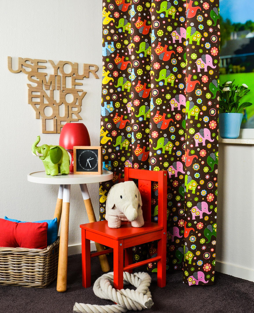 Dit decoratieve kindergordijn moet je eigenlijk in het écht zien! De nostalgische olifantjes zijn gedrukt op heel licht geribbelde stof. De ondergrond heeft een fraaie, warme kleur. Dat geeft extra gezelligheid aan de slaapkamer. De ‘fantjes’ zijn 10 cm groot en kijken lieflijk naar je wanneer jij speelt of naar dromenland gaat. Desgewenst verduisterend voeren.