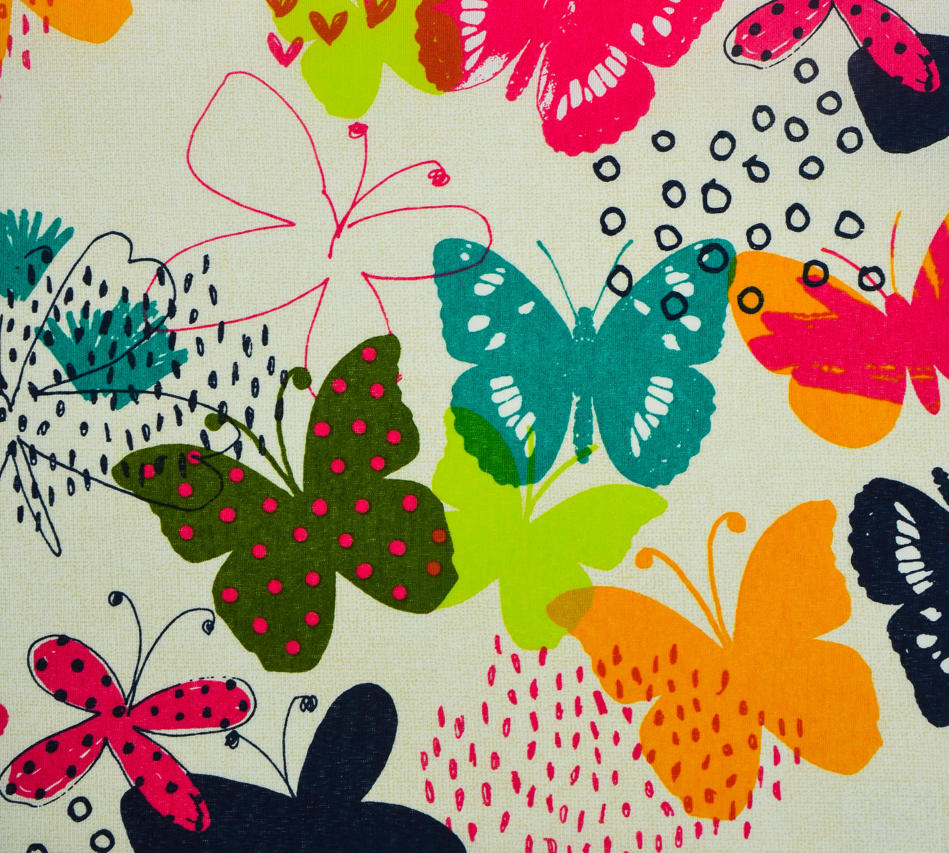 Vlinder, vrolijk, zomers, dat straalt dit gordijn helemaal uit! Het thema is leverbaar in 3 verschillende kleurpaletten. De vlinders zijn 10 tot 15 cm groot en gedrukt op ietwat geribde stof. De ondergrond is bij alle soorten een antiekwitte kleur, bijna linnenlook. Dit geeft een extra warme uitstraling. Dit gordijn is kamerhoog, dus voor dezelfde prijs kan je het fraai tot de grond laten maken. Voor extra kleurbehoud of verduistering, graag laten voeren.