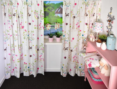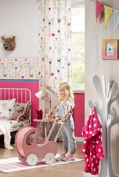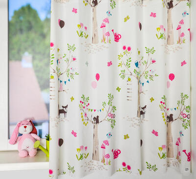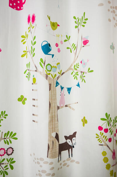 SCHATTIG! Nostalgisch getekende dieren zijn afgebeeld op dit kindergordijn. De stof is soepelvallend en in satijnlook fijn geweven. Het gordijn is leverbaar in 3 verschillende kleurpaletten, beide geschikt voor zowel de jongens- als meisjeskamer. De stam van de boom is b.v. 20 cm groot, het vosje 8 cm. Krijg jij een kindje en je weet niet wat “het” gaat worden, dan is dit een uitstekende keuze. Stippen behang op 1 wand is een leuke combi, al dan niet met een subtiel vosje erop. Voor verduistering graag optie voeren in het bestelproces aanvinken.