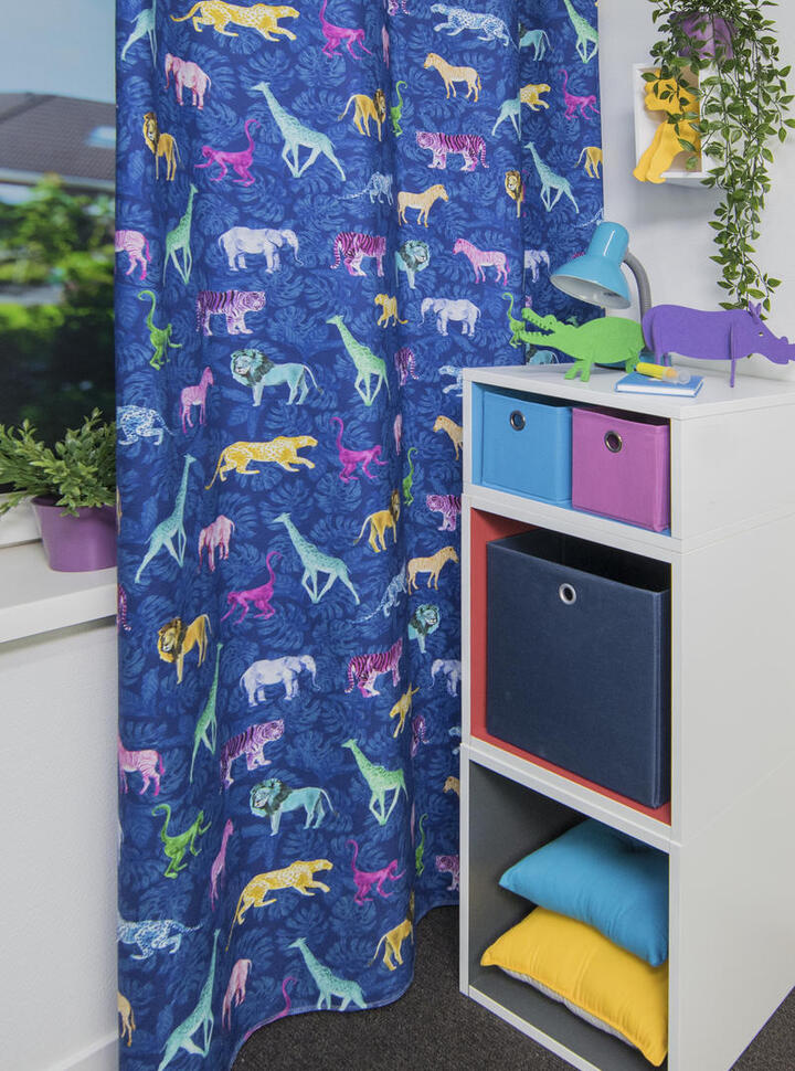 Deze gordijnstof met de naam Safari Blue is gemaakt van de beste materialen waardoor het gordijn mooi in de plooi valt.