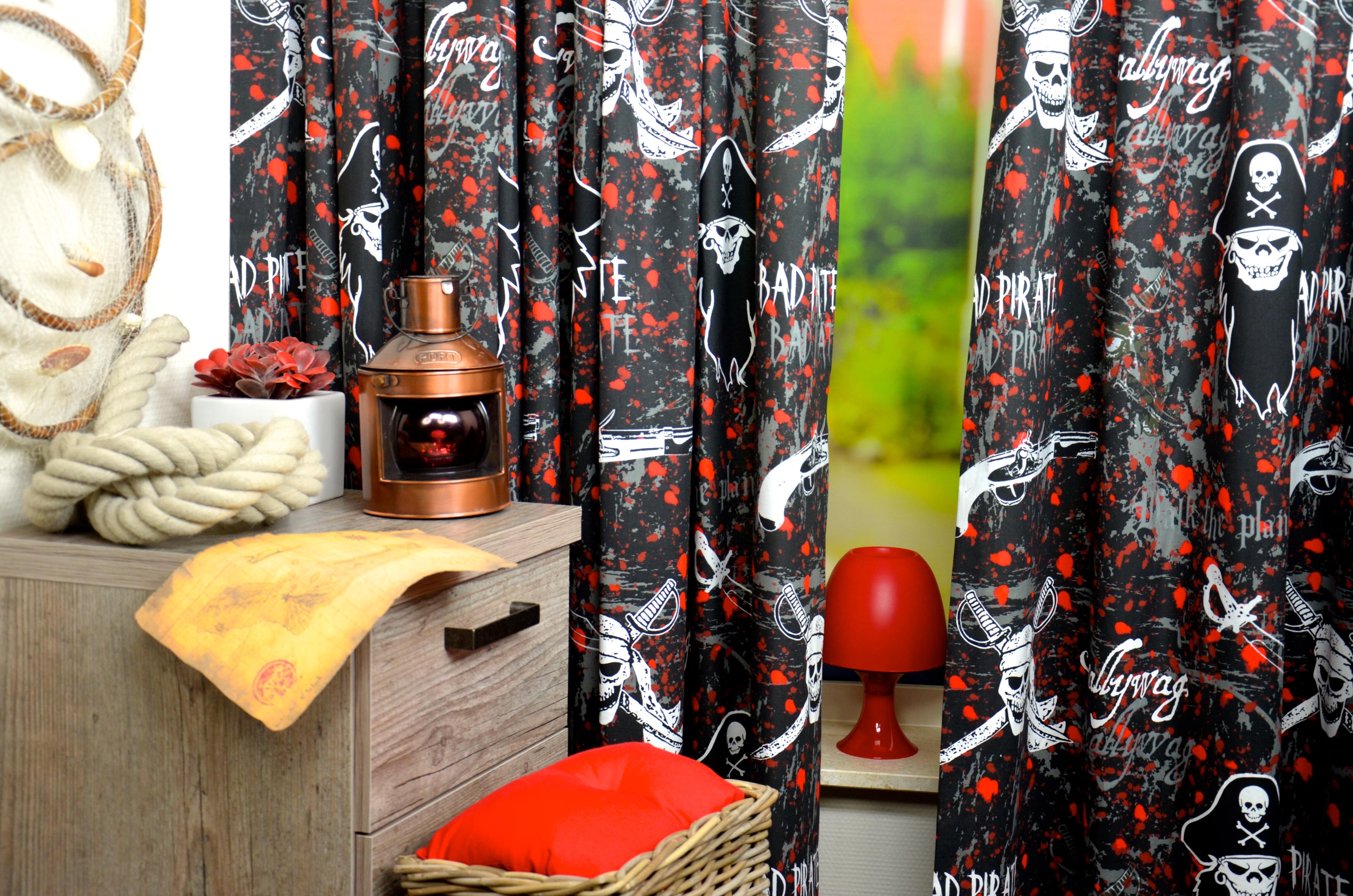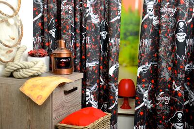 Bloedstollend piratengordijn voor stoere jongens die nergens bang voor zijn! Het ScallyWay gordijn heeft een spannende kleurencombinatie van zwart en rood. Pistolen, zwaarden en Jolly Rogers zijn allemaal terug te vinden op dit kindergordijn!