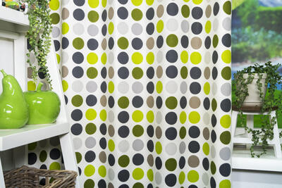 STIPPEN zijn HIP! En dit gordijn heeft royale stippen in frisse lime kleuren. De stip is 4,5 cm in doorsnede en is in wisselende groentinten op het doek aangebracht. Dat geeft een speels en kleurrijk effect. De ondergrond is een warm witte, dicht geweven stof, die desgewenst verduisterend gevoerd kan worden.