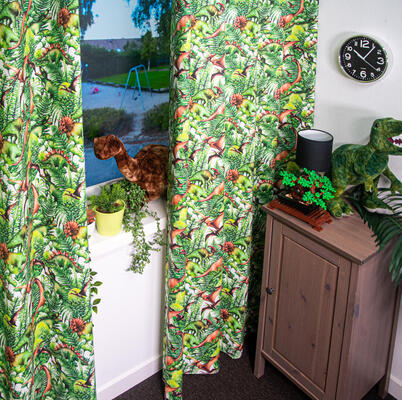 Kijk voor accenten die passen bij het thema Dinosauriërs ook eens naar de mogelijkheden met meubels en accessoires voor de inrichting van de kinderkamer. Laat voor een aangename verduistering van de kamer de stof voeren: een verschil van dag en nacht.