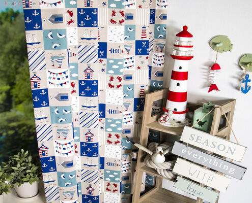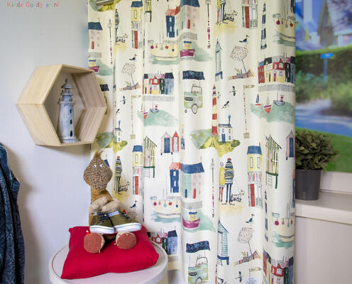 De zee roept ons van jongs af aan. Het thema Maritiem kent veel variatie. Kindergordijnen in de kleuren van een mooie zomerdag op het strand. Schelpen, vuurtorens, meeuwen, krabben, tenten en zandkastelen. Vaar door vlakken in de ruimte langs het kleurige koraal. Tover de kinderkamer om tot kajuit of piratenhol. Koers op je fantasie en je bed wordt een boot op het wijde water. Bekijk de netten op de steiger, het ruige touw en het aangespoelde hout. Keer op keer tel je de goudstukken of kijk je naar het oude handschrift in het scheepslogboek.