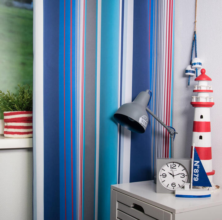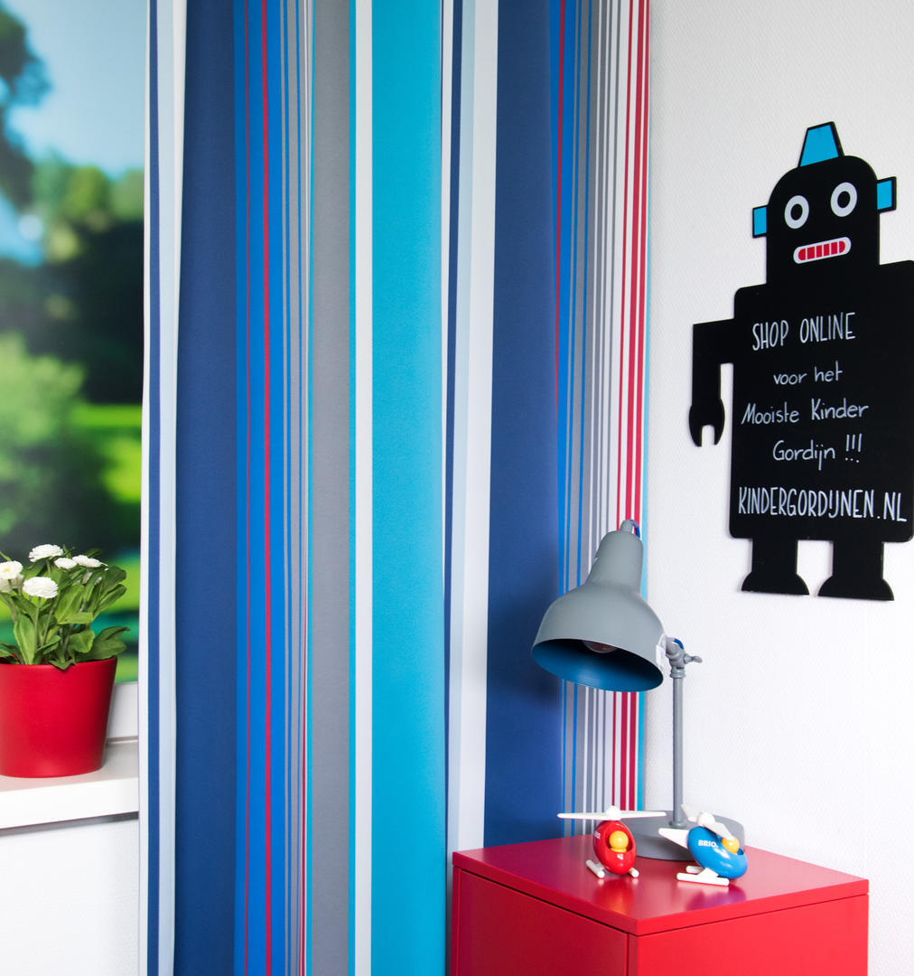 Een vernieuwend TOPPERTJE, dat is dit gordijn! Verduisterende stof gecombineerd met tijdloze, rustige strepen. De kleurcombinaties zijn zo gekozen dat het gordijn uitstekend in de jongens- én meisjesslaapkamer past. De stof valt soepel en is egaal lichtgrijs aan de achterzijde. Door de speciale fabricage techniek, komt er nagenoeg geen daglicht doorheen. Moeilijke slapers kunnen op deze manier toch wat langer in dromenland blijven, de slaapkamer blijft aangenaam donker! Door het verticale streepdessin krijgt de kamer optisch wat hoogte mee, dat zorgt voor een ruimtelijk effect. Ook kan je een streep nog met ieder ander patroon combineren. Kortom: Een SUPER keuze en snelle levering gegarandeerd!
