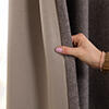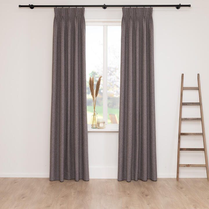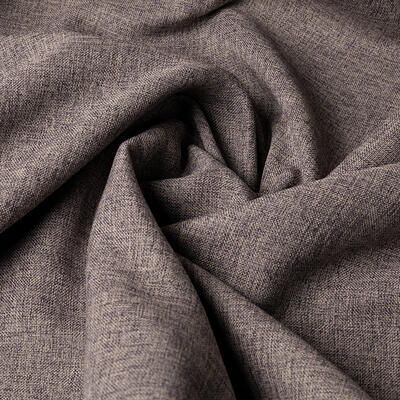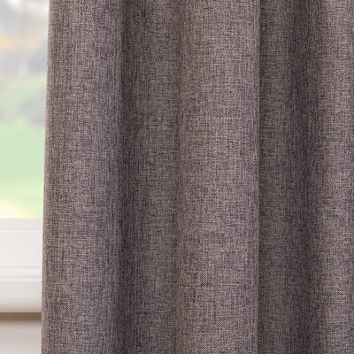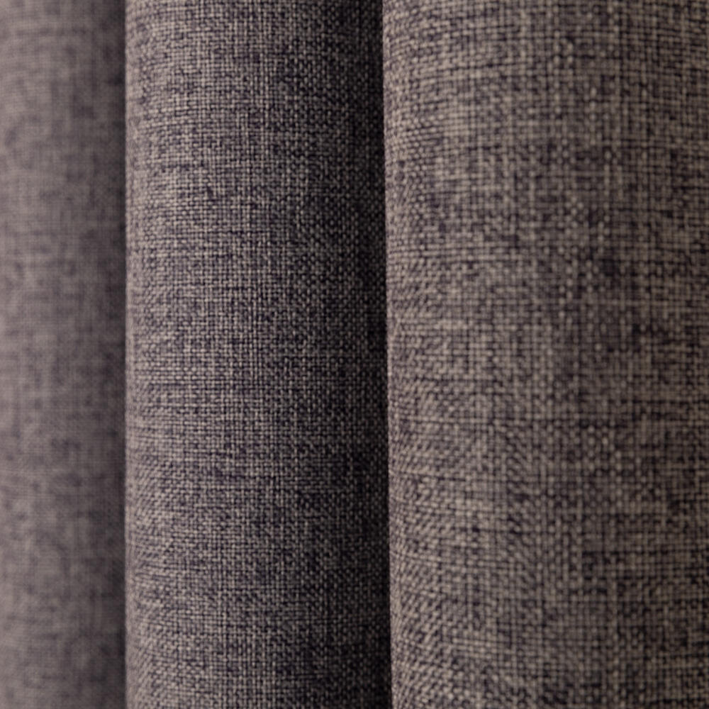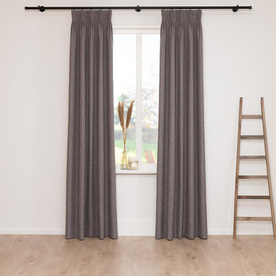 Vlamwerende en half verduisterende volumineus vallende gordijnstof met natuurlijk ogende structuur. De achterzijde van het gordijn is glad geweven.
