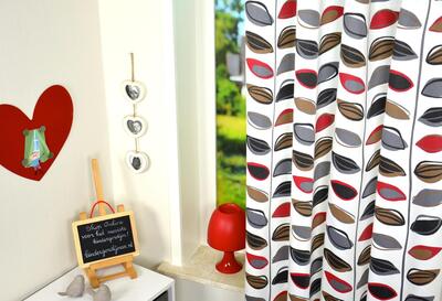 De Leave is een trendy kindergordijn met sfeervol bladmotief. In de twee uitvoeringen van de katoenen gordijnstof zijn drie prachtige kleuren verwerkt en fleurt daarmee elk meisjes of jongens kamer op.