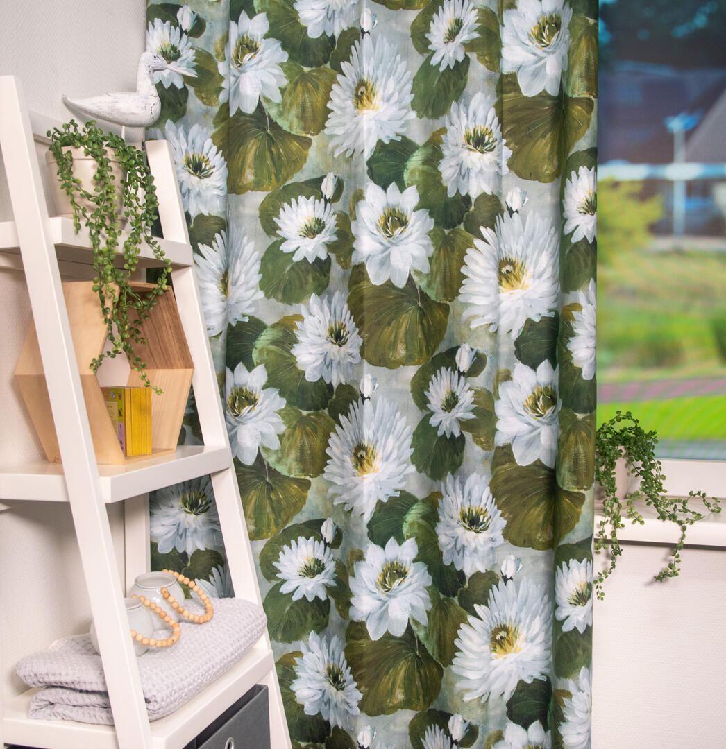 Deze gordijnstof met de naam Waterlelie is gemaakt van de beste materialen waardoor het gordijn mooi in de plooi valt.